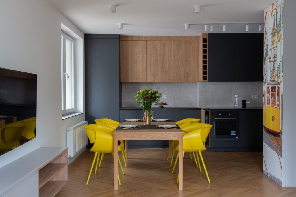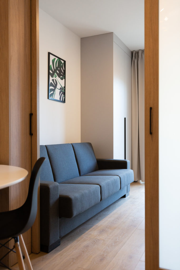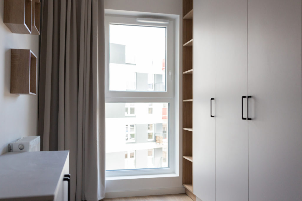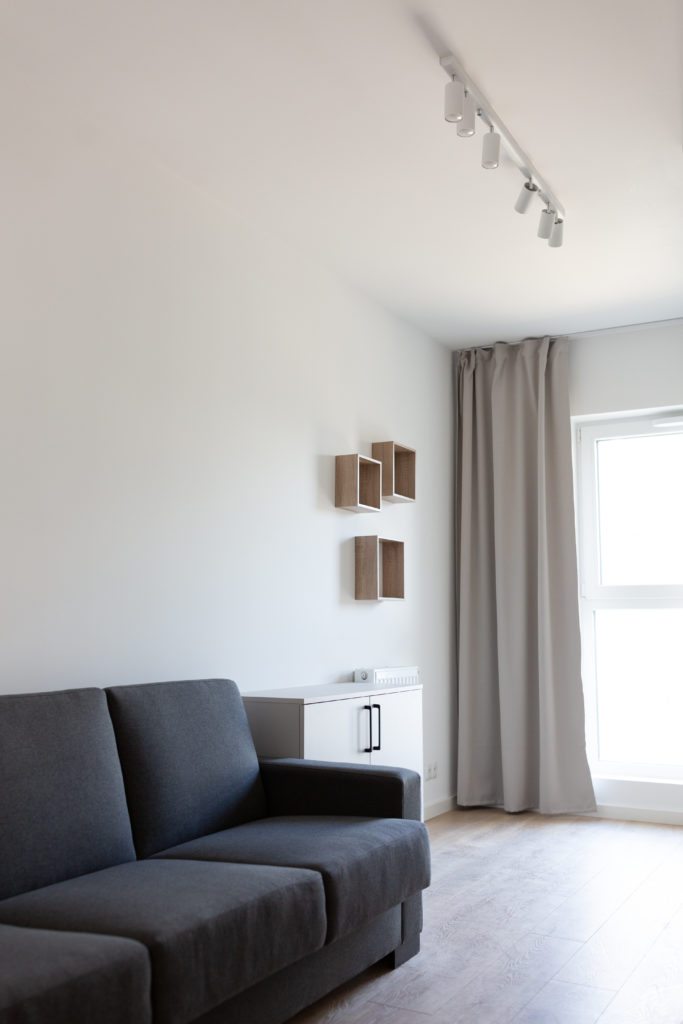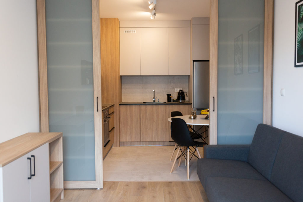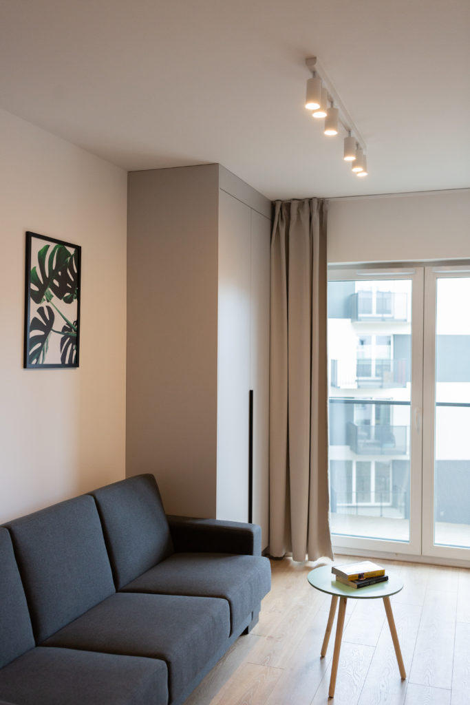 Kolejna realizacja mieszkania na wynajem. Zaprojektowaliśmy jasne, nowoczesne wnętrza. Zadbaliśmy o odpowiednią przestrzeń dla każdego i wygodę użytkowania. Kluczem do sukcesu w przypadku tej aranżacji jest oryginalna zabudowa meblowa, w tym przesuwne drzwi między kuchnią a salonem.