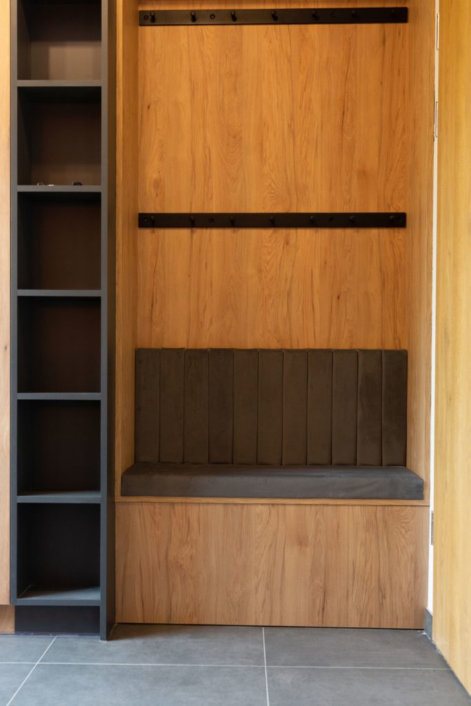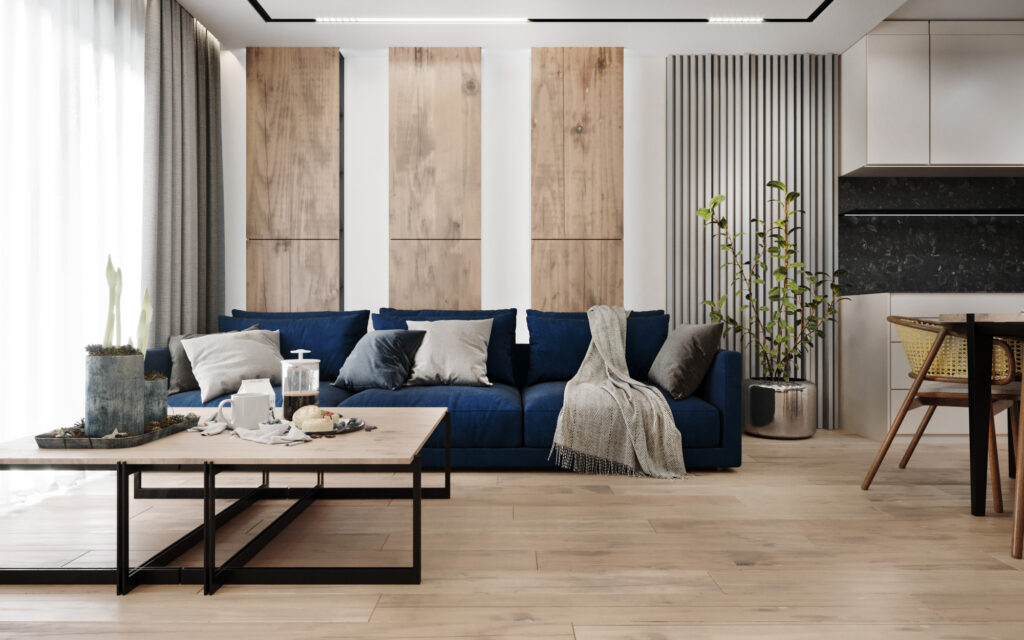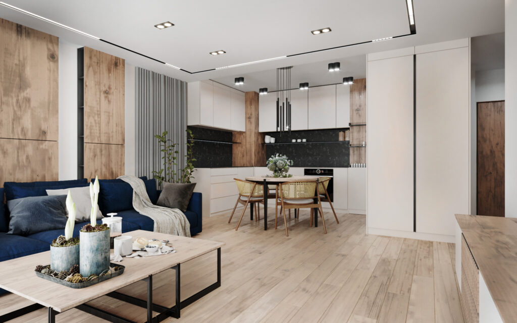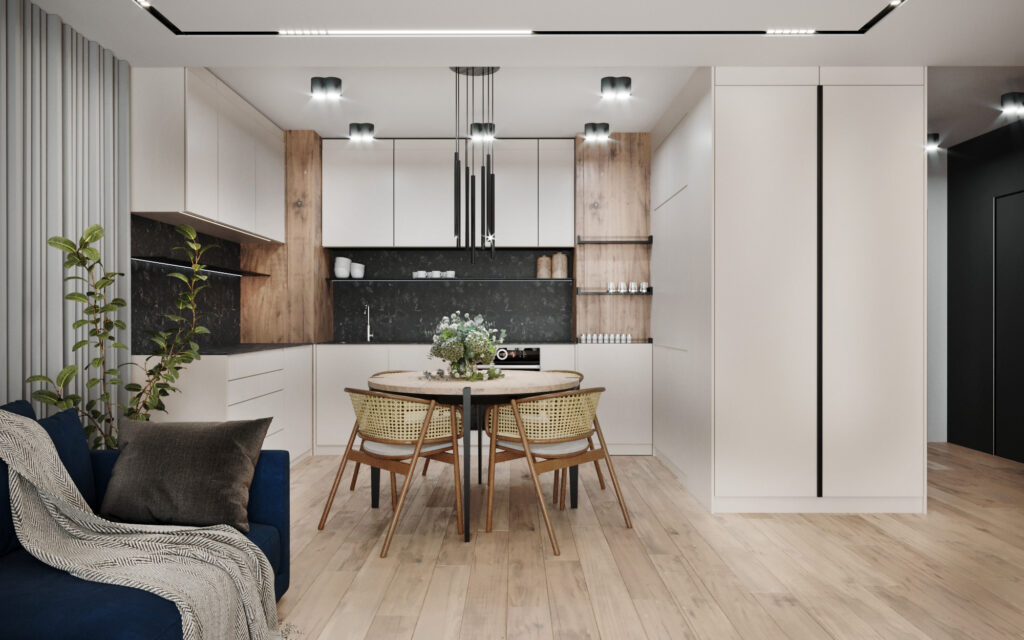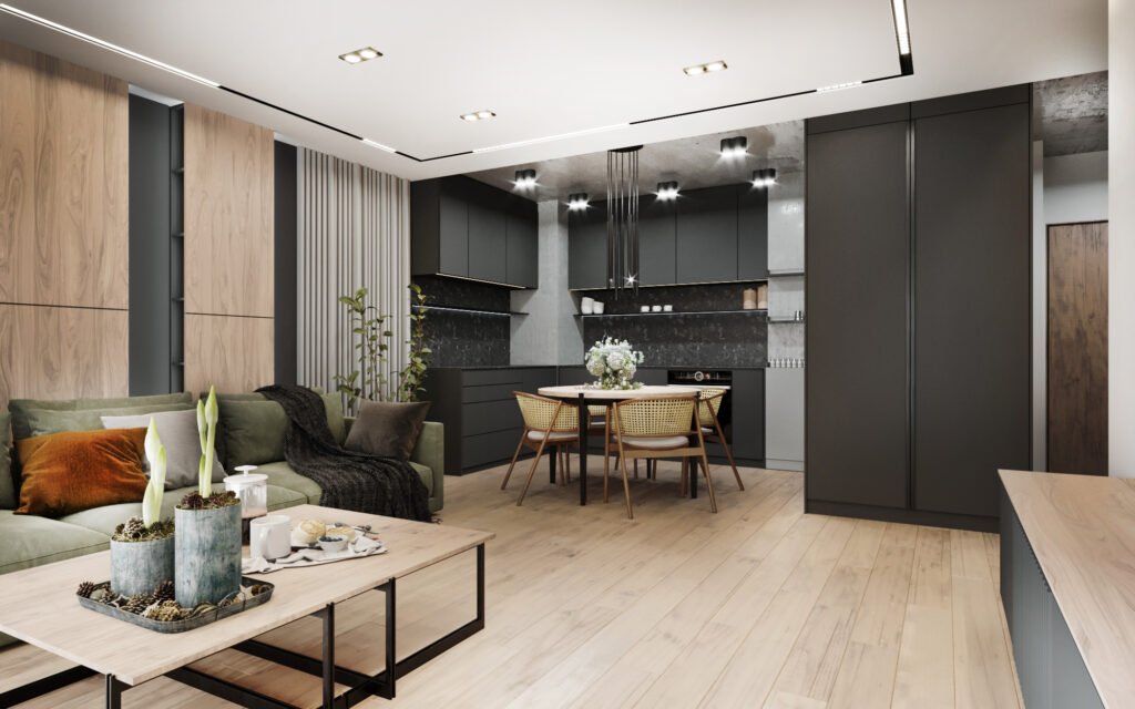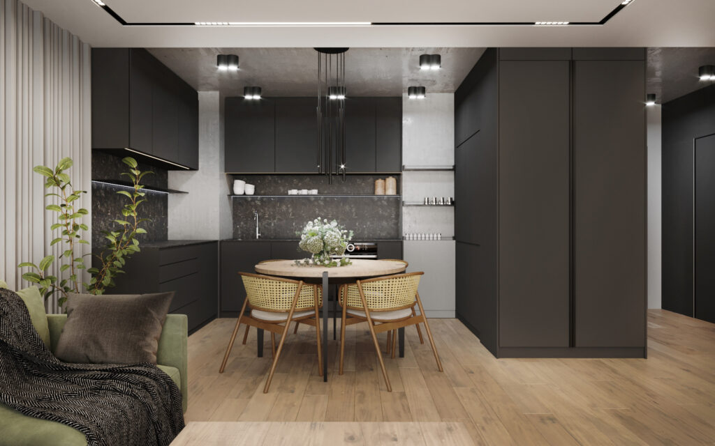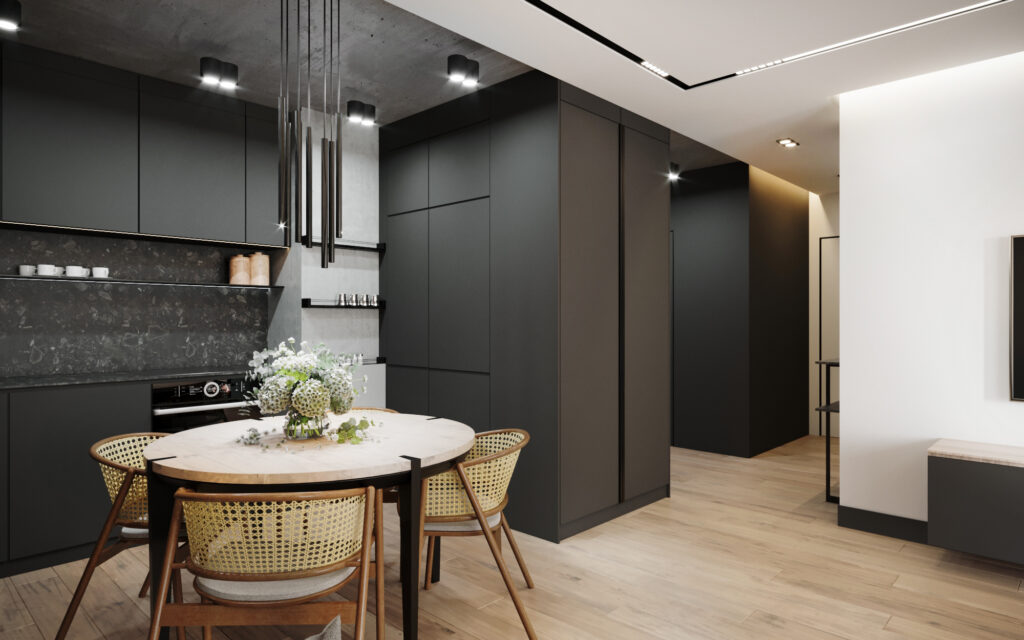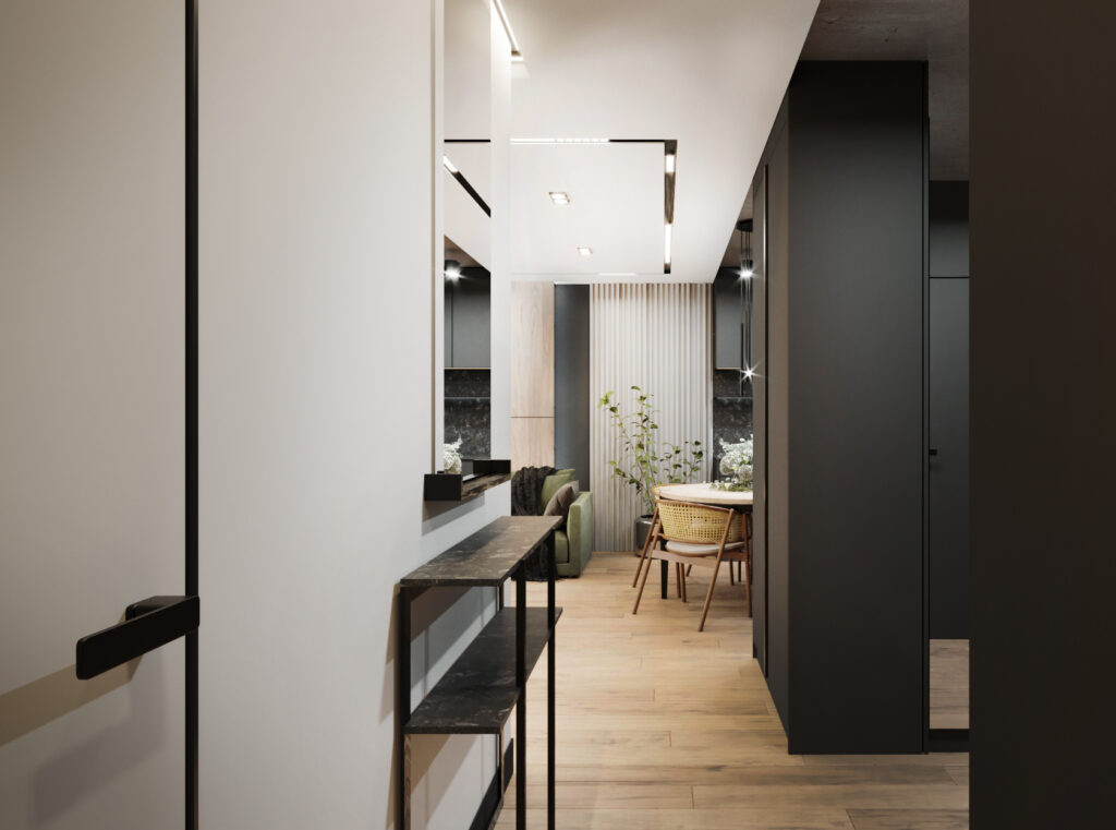 Na życzenie klienta przygotowaliśmy wizualizację tego mieszkania w dwóch wersjach: ciemnej i jasnej. W obu odmianach to nowoczesne wnętrza o wyrazistym charakterze. Zastosowanie wysokiej jakości materiałów, w tym naturalnego drewna i forniru, podkreśla wyjątkowość aranżacji.