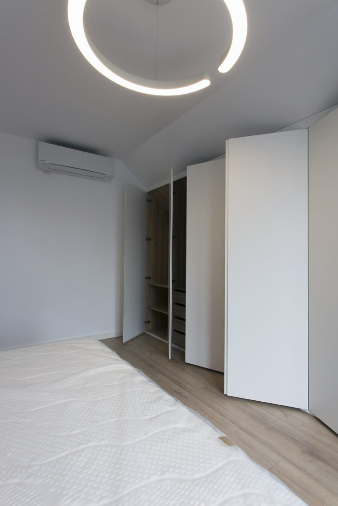 Na stosunkowo niewielkiej powierzchni zaprojektowaliśmy wygodny, przestronny apartament. Dzięki odpowiedniemu zagospodarowaniu przestrzeni zapewniono miejsce do pracy i odpoczynku. Bardzo jasne, nowoczesne wnętrza są niezwykle eleganckie i stylowe.