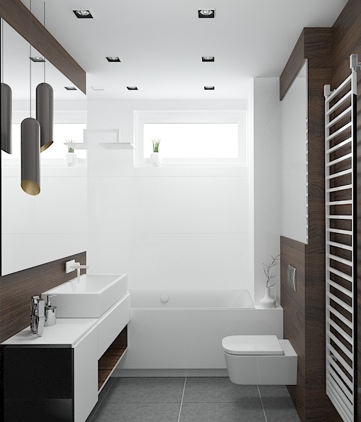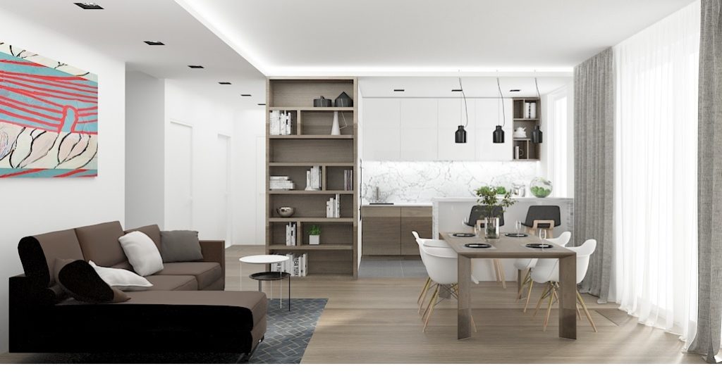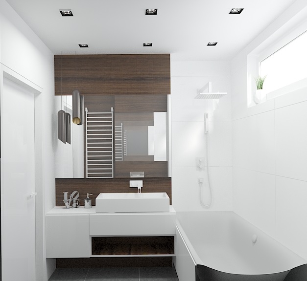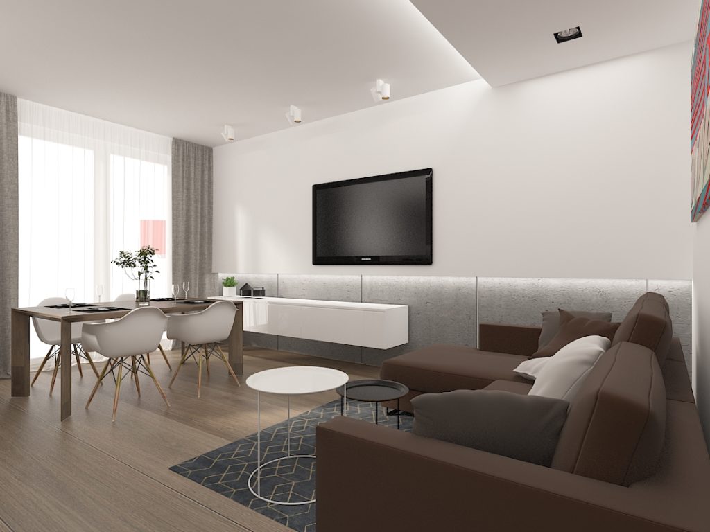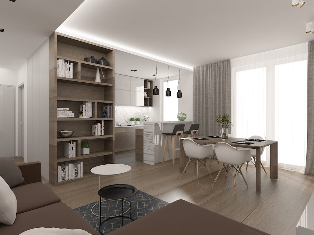Przygotowana przez nas wizualizacja projektu mieszkania na krakowskim osiedlu Bagry Park. Prezentujemy różne ujęcia salonu z aneksem kuchennym i meblami na wymiar oraz kilka wersji łazienki.