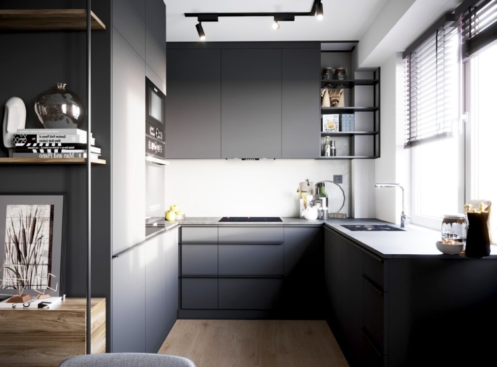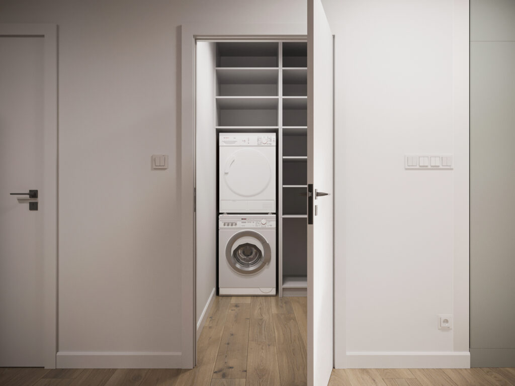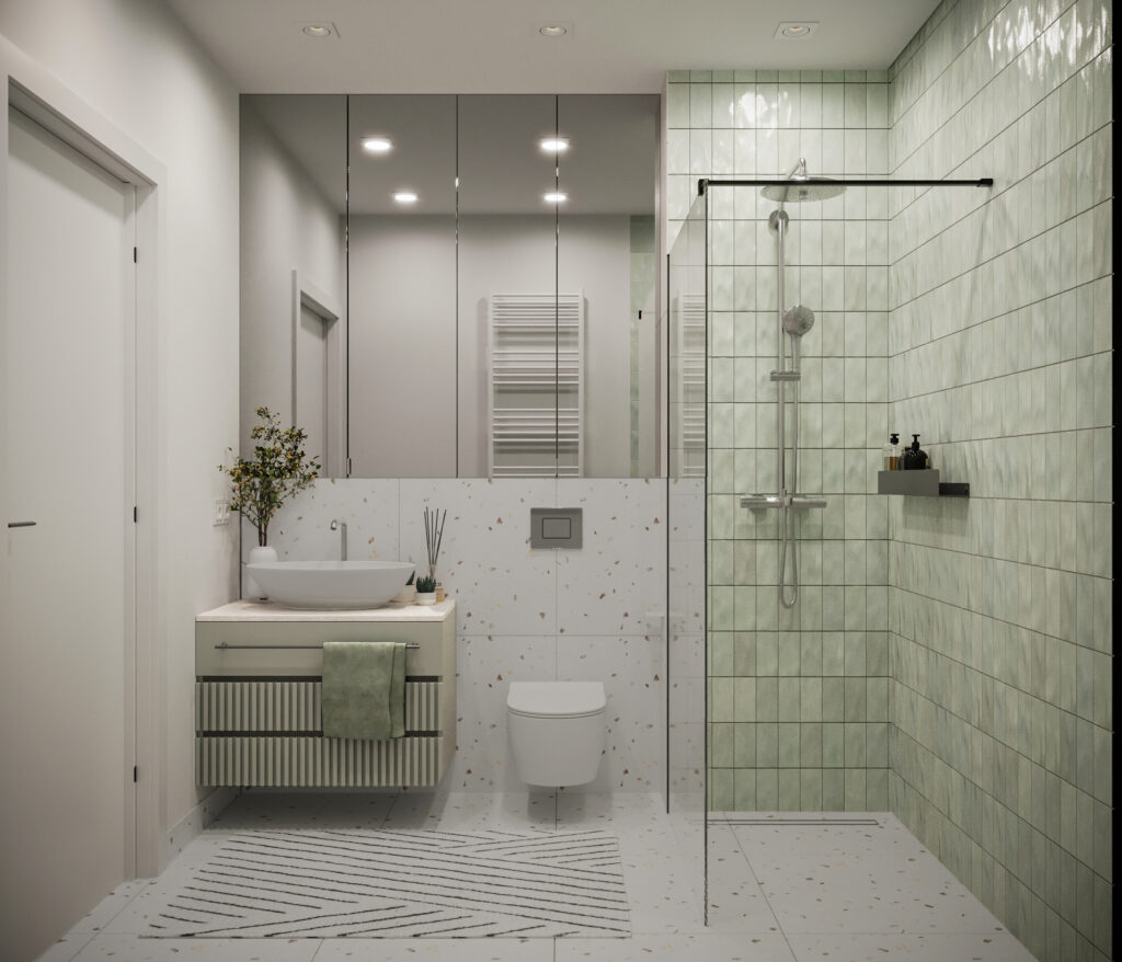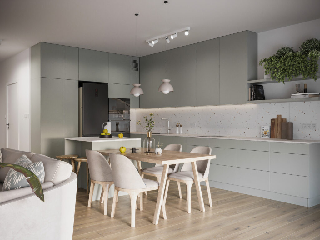 Całościowa aranżacja w nowoczesnym stylu na ulicy Wizjonerów 6 w inwestycji Mieszkaj w Mieście. W tym wnętrzu postawiliśmy na kompleksowy dobór mebli na wymiar, aby projekt był spójny i estetyczny. Elegancka kompozycja trzech kolorów: szarości, pistacji i jasnego drewna sprawia, że pomieszczenia są jasne, ale przy tym przytulne. Na tym tle doskonale można wyeksponować piękne rośliny doniczkowe.