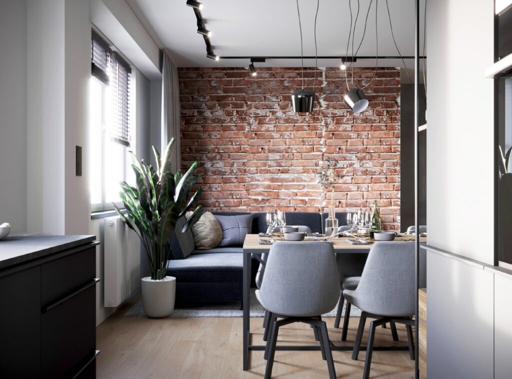 Projekt nowoczesnego mieszkania z elementami stylu industrialnego. Uwagę zwraca zastosowanie cegły i zaproponowanie nietuzinkowych dodatków, które urozmaicą stonowane, przyciemnione wnętrza. Z uwagi na dominację szarości i czerni pamiętaliśmy o zaprojektowaniu odpowiedniego oświetlenia. Całość aranżacji jest spójna i przemyślana. Mamy nadzieję, że przyszli mieszkańcy pokochają to wnętrze!