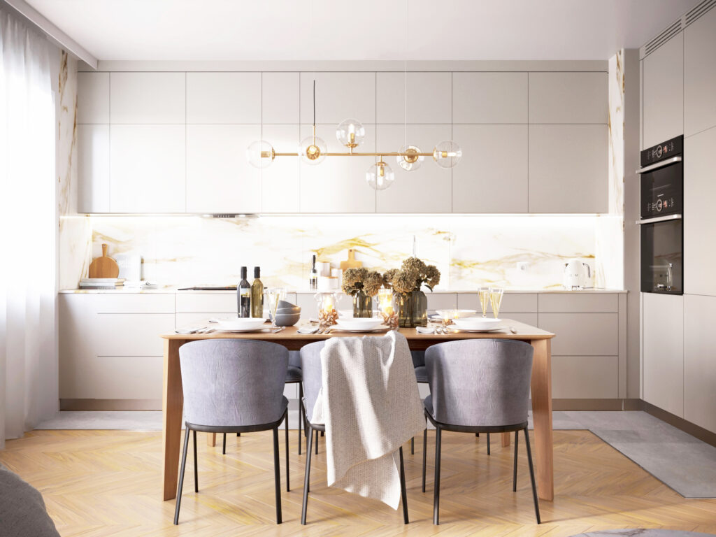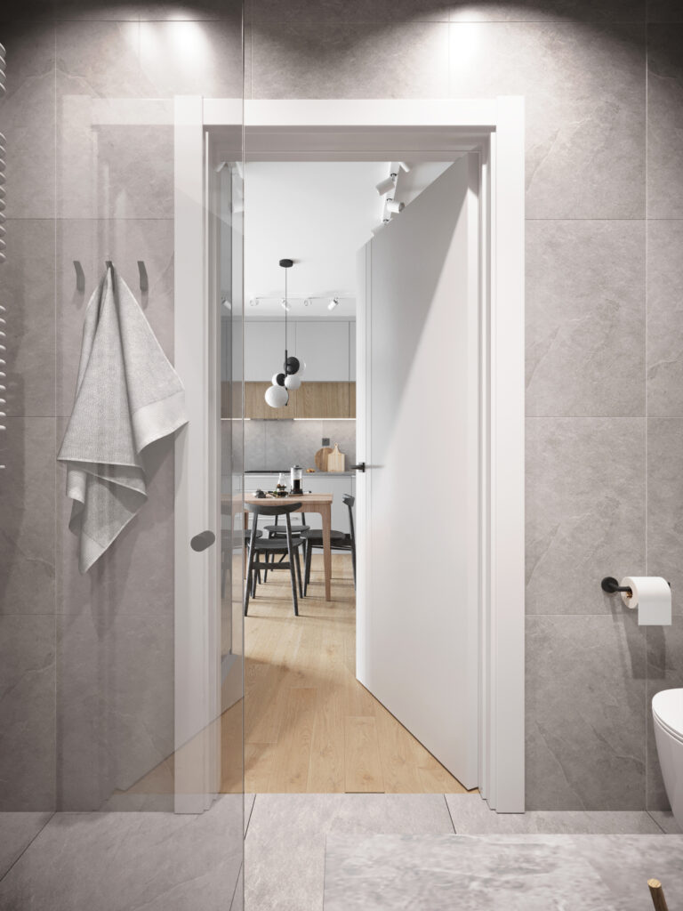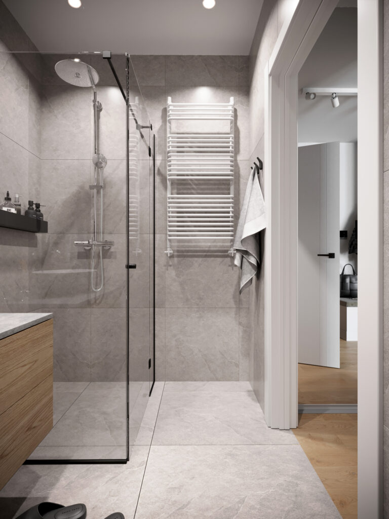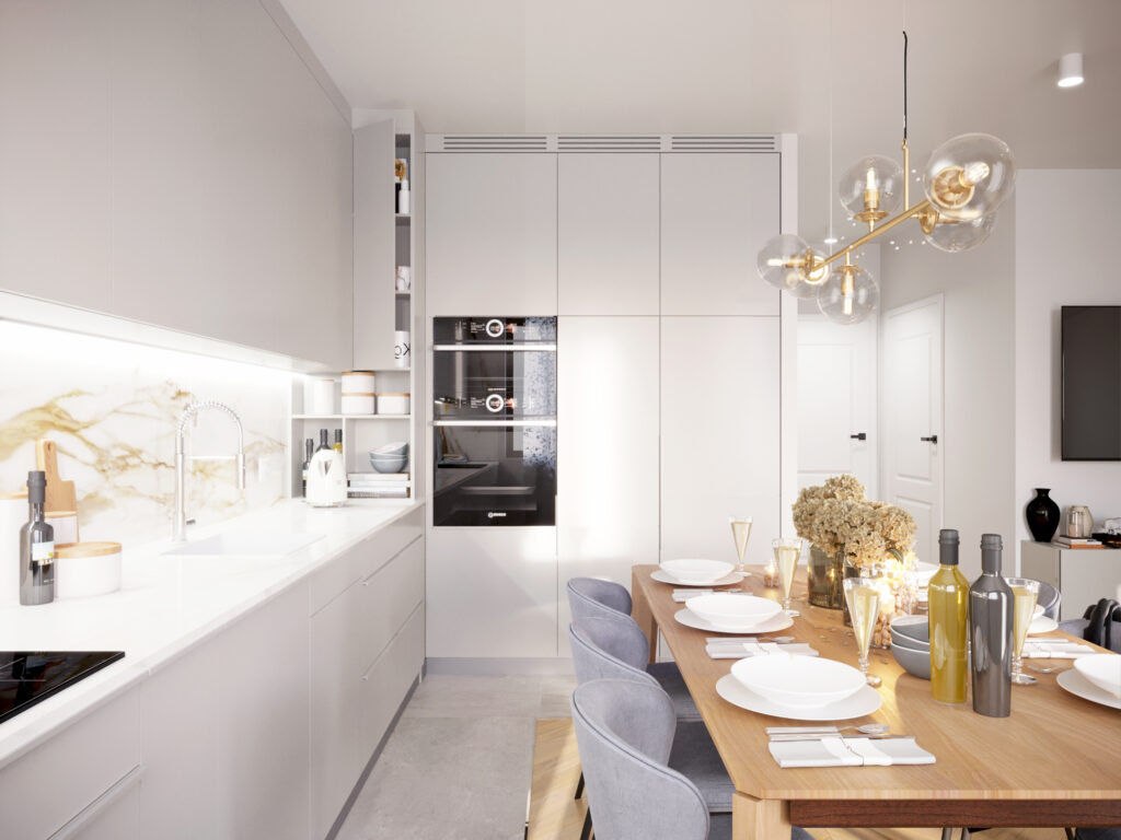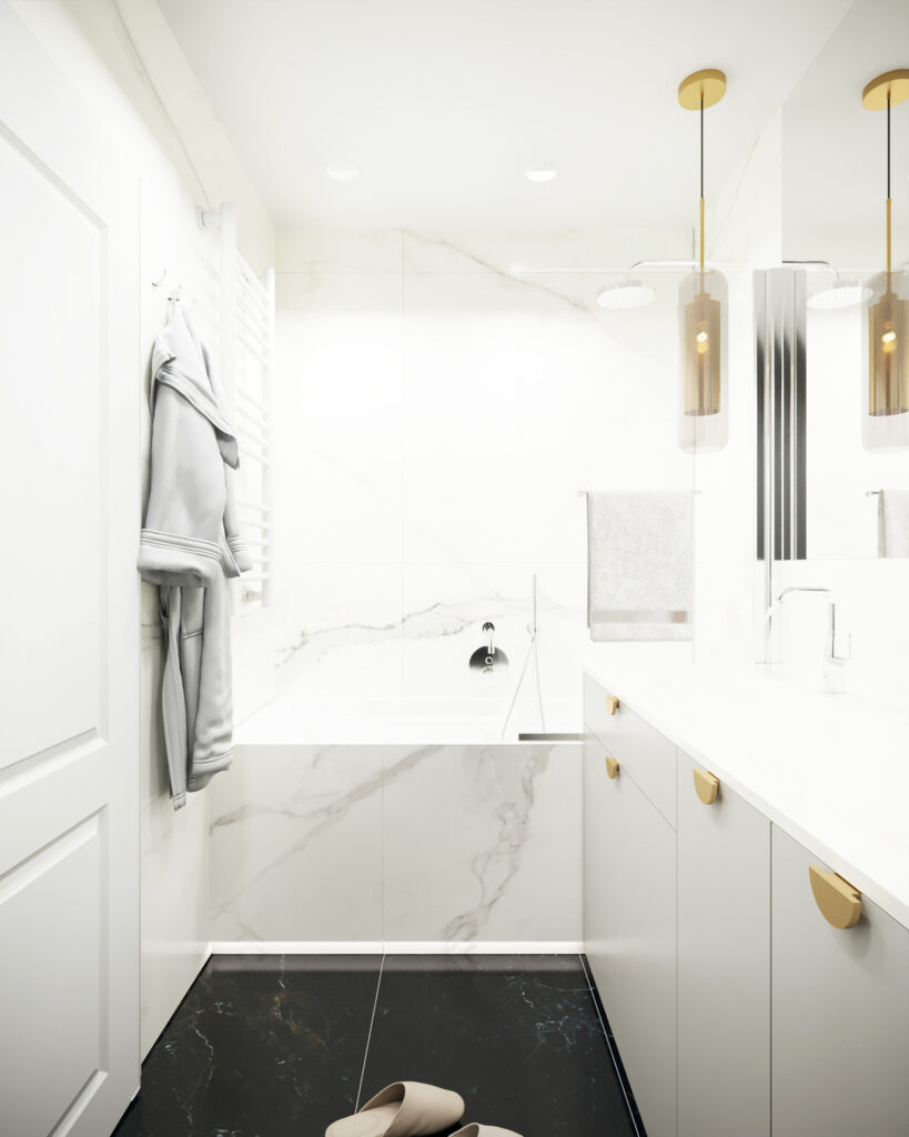 Aranżacja 60-metrowego mieszkania na nowym krakowskim osiedlu. Dzięki przemyślanemu doborowi barw i mebli oraz elementów wyposażenia udało nam się osiągnąć efekt przestronności i elegancji. Zaprojektowaliśmy jasną kuchnię z meblami w kształcie litery L, otwarty salon, a także wygodną sypialnię i piękną łazienkę w dwóch odcieniach marmuru.