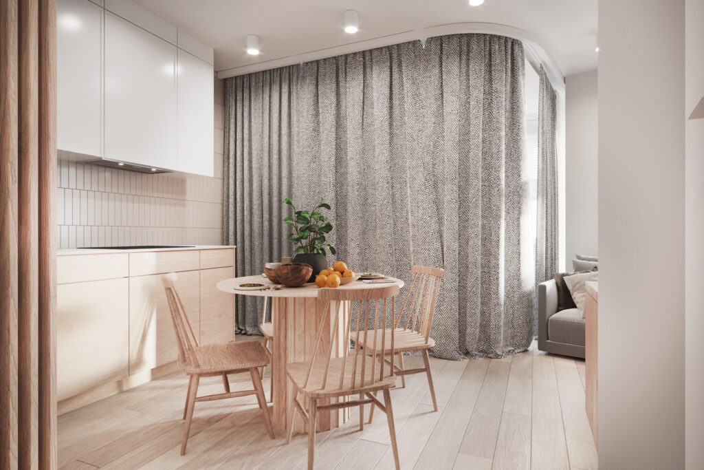 Nasz niezawodny sposób na urządzanie niewielkich mieszkań: czytelne wydzielenie stref i spójność aranżacji całości. W tej propozycji w obu wersjach postawiliśmy na nowoczesne wnętrze i naturalne, jasne kolory. Dobraliśmy okrągłe dodatki: wiklinową lampę nad stołem, okrągły stół na grubej nodze, duże, okrągłe lustro podświetlone od góry kinkietami i okrągłą, nablatową umywalkę. W drugim wariancie zaproponowaliśmy ciekawe rozwiązanie z tymczasowym wydzieleniem przestrzeni za pomocą grubej kurtyny na szynie.
