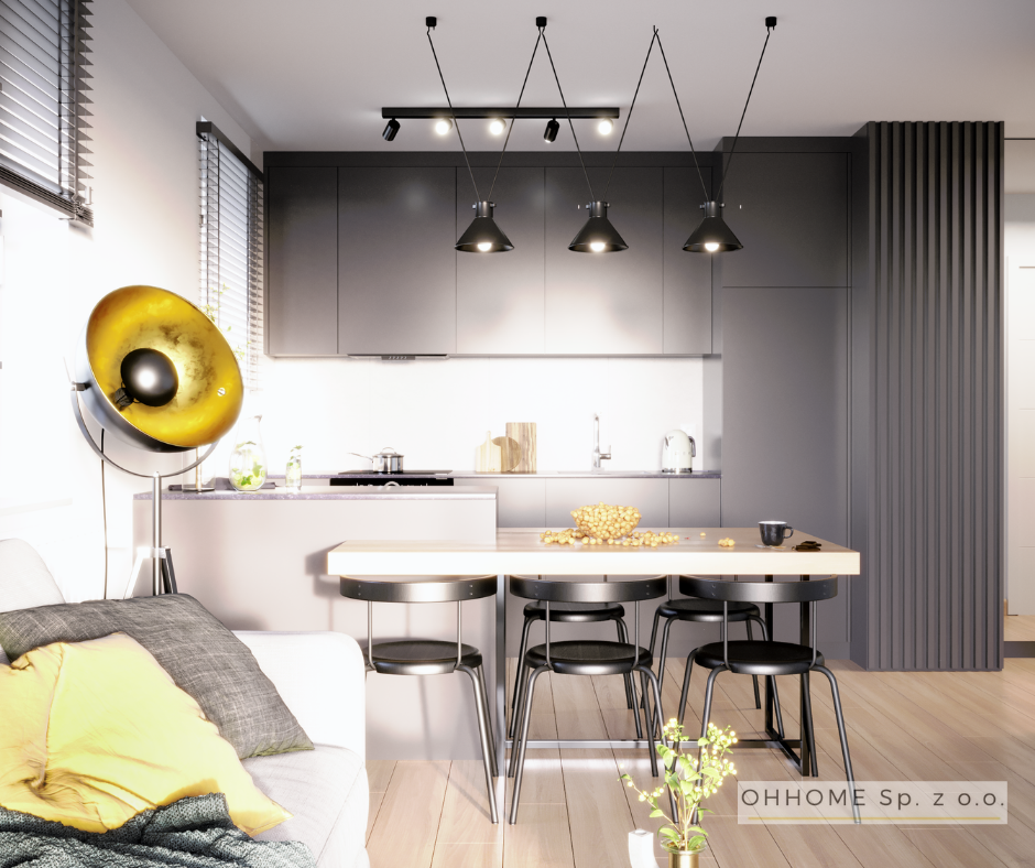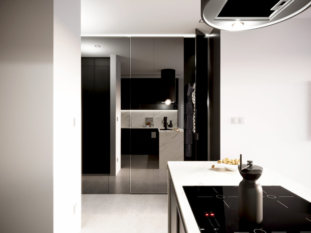 Niewielkie, ale zaprojektowane w najdrobniejszym detalu, monochromatyczne biało-czarne mieszkanie. Taka kolorystyka daje ciekawe możliwości zabawy kontrastem, a z drugiej strony różnymi odcieniami szarości, która nadal nie wychodzi z mody. To świetna propozycja dla tych, którzy chcą postawić na ponadczasową aranżację, ale także dla tych, których gust nie jest jeszcze skonkretyzowany i chcą mieć dobrą bazę, aby potem upiększać swoje mieszkanie.