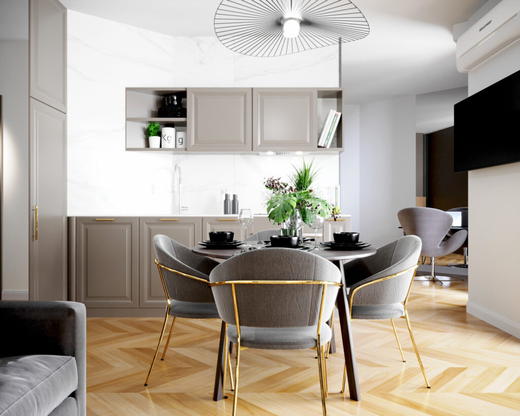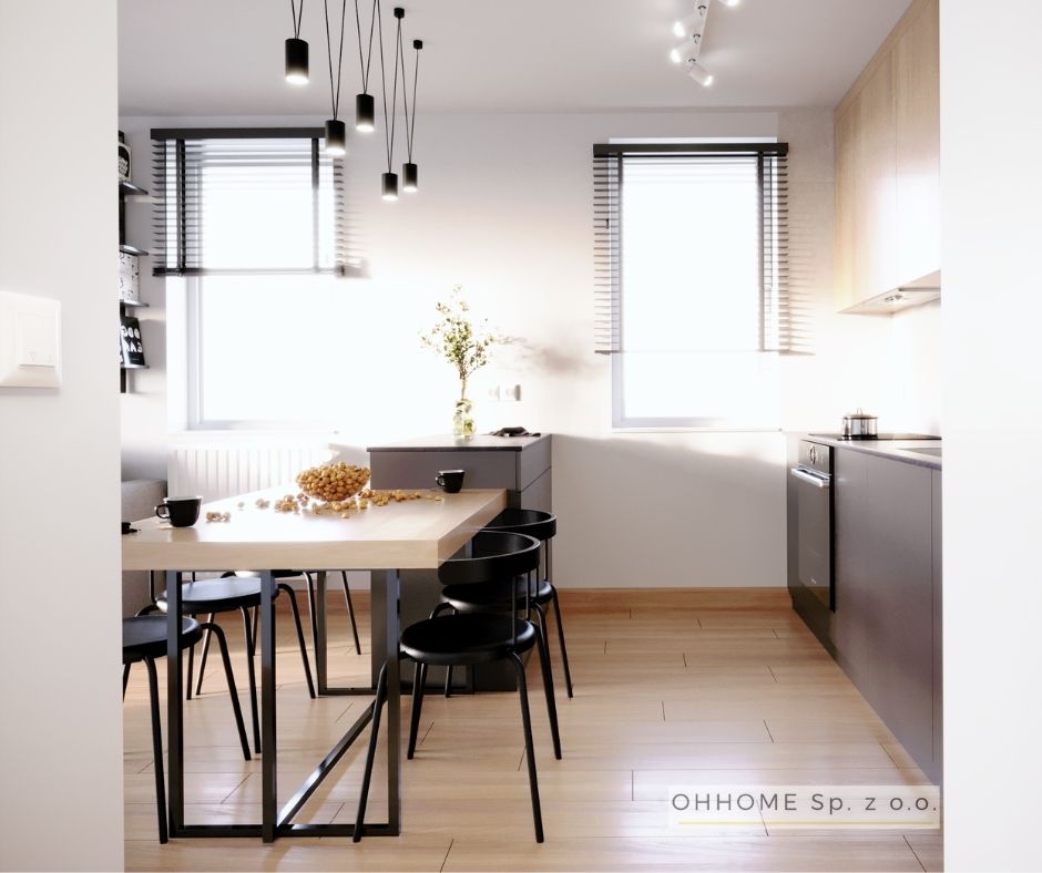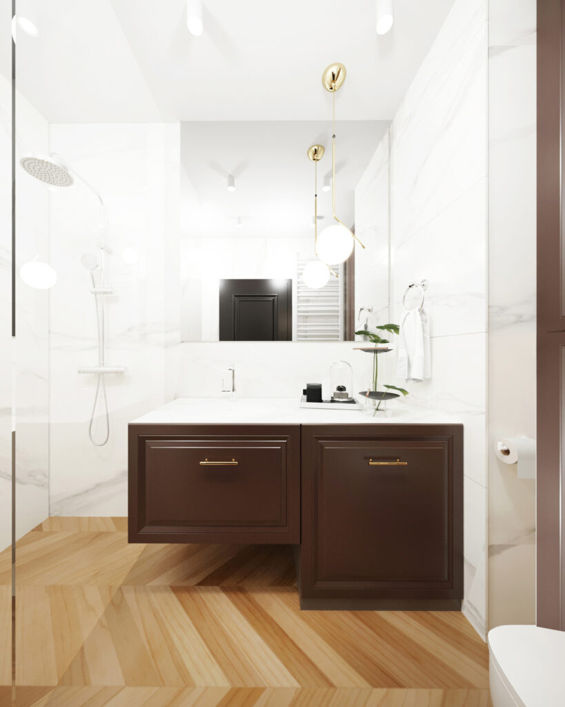 Nasza kolejna realizacja to elegancki apartament w Krakowie. Przygotowaliśmy nowoczesną stylizację z lekką nutką glamour. W pomieszczeniach dominują naturalne kolory, a główną rolę grają piękne, nowoczesne dodatki, jak duża wisząca lampa czy krzesła ze złotymi nogami. W łazience zaproponowaliśmy zaś meble w odcieniu czekolady.