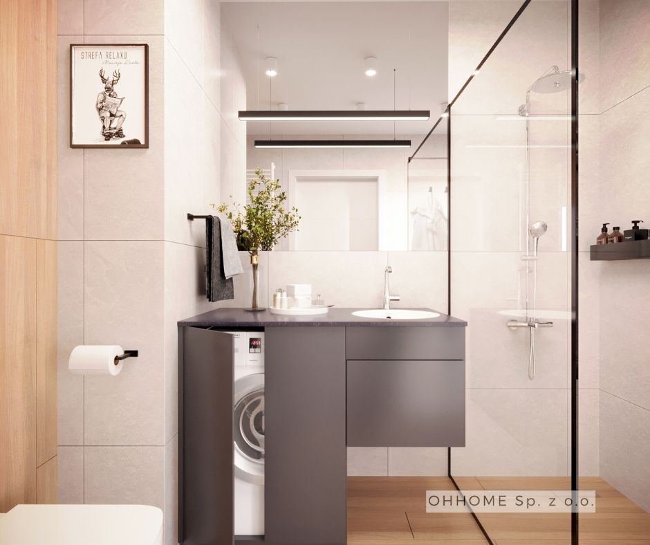 W tej nowoczesnej aranżacji odnajdziemy elementy stylu skandynawskiego, ale też inspirację industrie. Zadbaliśmy o miejsce do biesiadowania z przyjaciółmi, o wygodne półki na książki w zasięgu ręki, o przytulną sypialnię, a także o funkcjonalną łazienkę z zabudowaną pralką. Wnętrza są jasne, nieprzeładowane i spójne stylistycznie. Na zdjęciach prezentujemy dwie wersje kolorystyczne mieszkania.