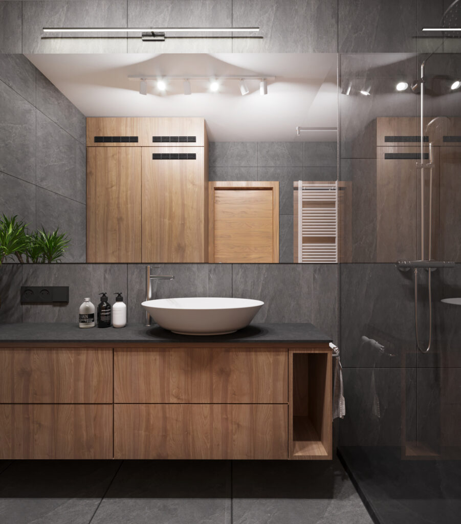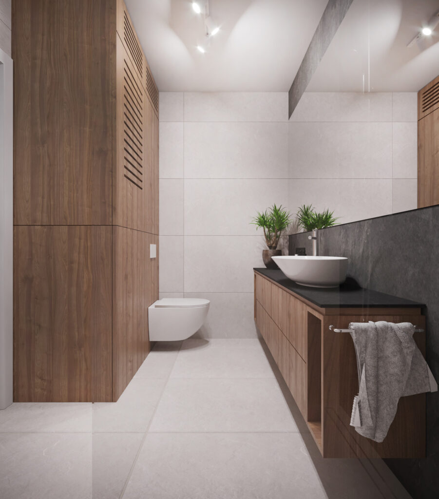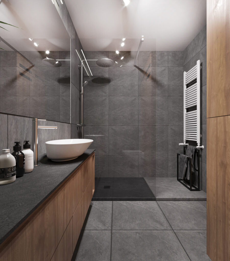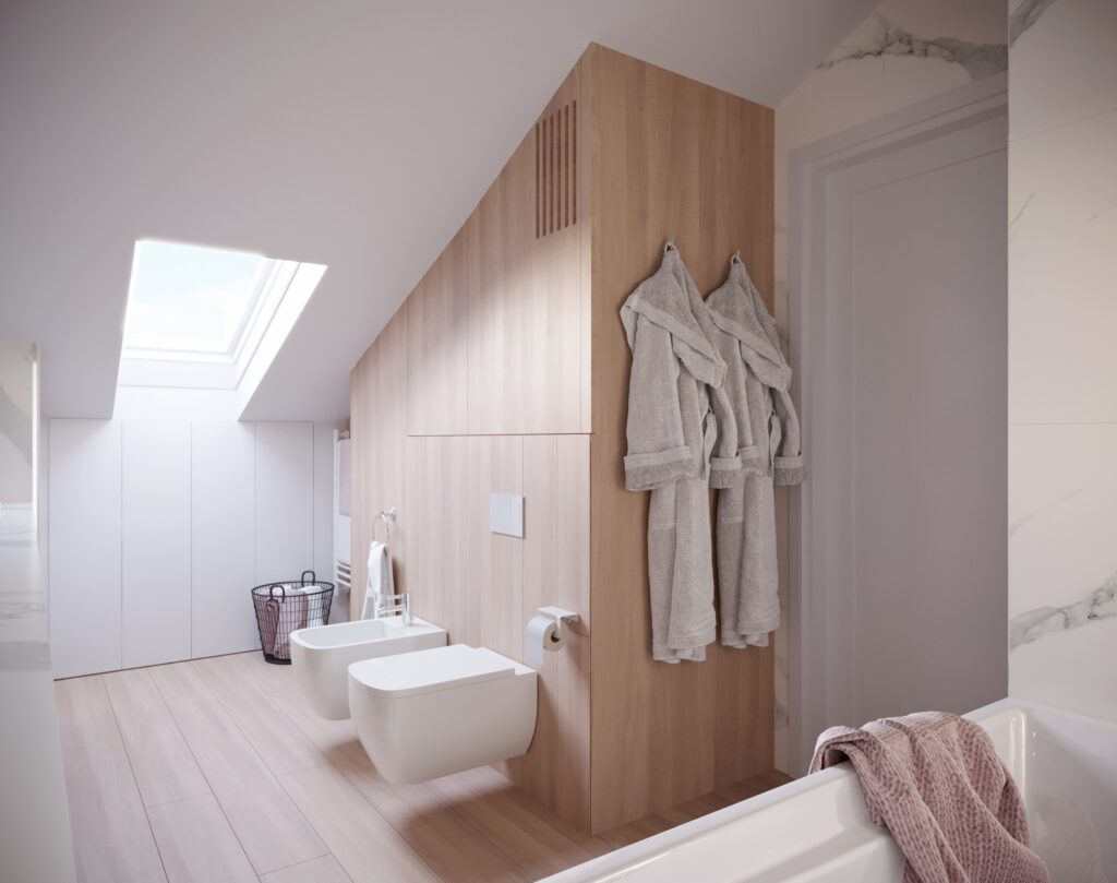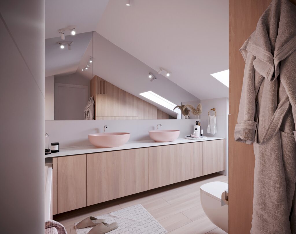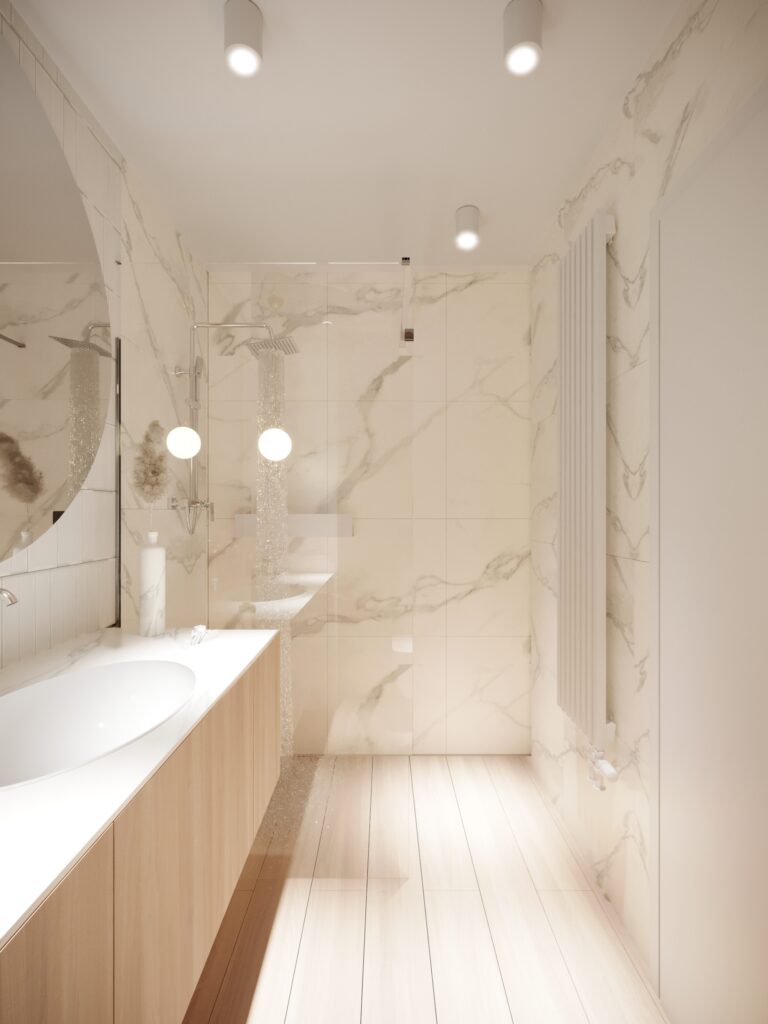 Przygotowane przez nas dla inwestorów trzy odmienne wersje głównej łazienki w dwupoziomowym apartamencie. Dzięki wizualizacjom łatwiej jest wybrać najbardziej odpowiadającą nam wersję kolorystyczną danego pomieszczenia, a także dokonać niezbędnych poprawek jeszcze przed rozpoczęciem realizacji inwestycji. Używane przez nas nowoczesne narzędzia sprawiają, że wizualizacje bardzo dobrze odwzorowują docelowy wygląd mieszkania.